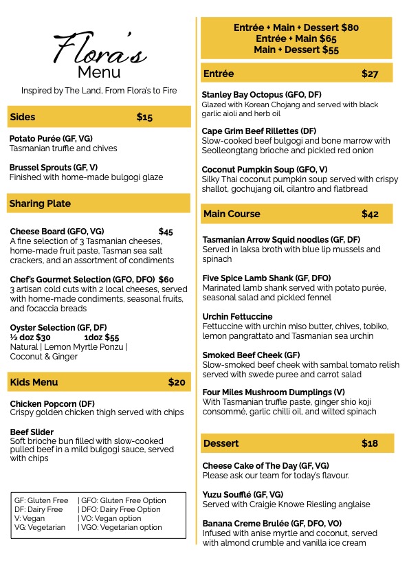 Set within a marquee among the vines, Flora’s presents a modern Tasmanian menu with Asian flair, inspired by the land around us. Many ingredients, including seasonal vegetables and selected meats, are sourced directly from our estate, highlighting the flavours of the vineyard and the region.